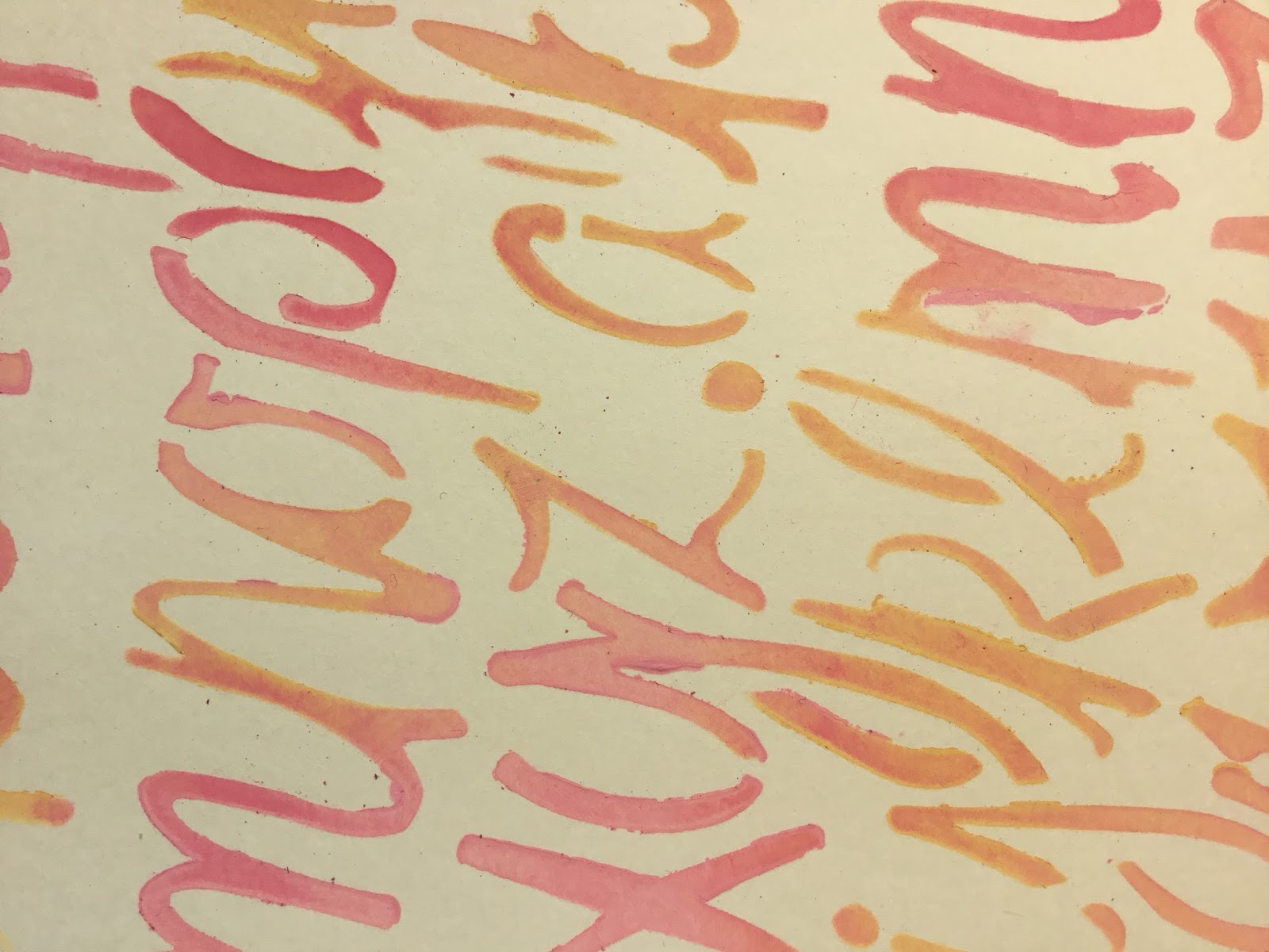 Here We've used the New Dylusions Vanilla Custard, Peony Blush, and Rose Quartz Paint and the blocking technique. The stencils used are Modern Script, Stained Glass and Fresh Dots.