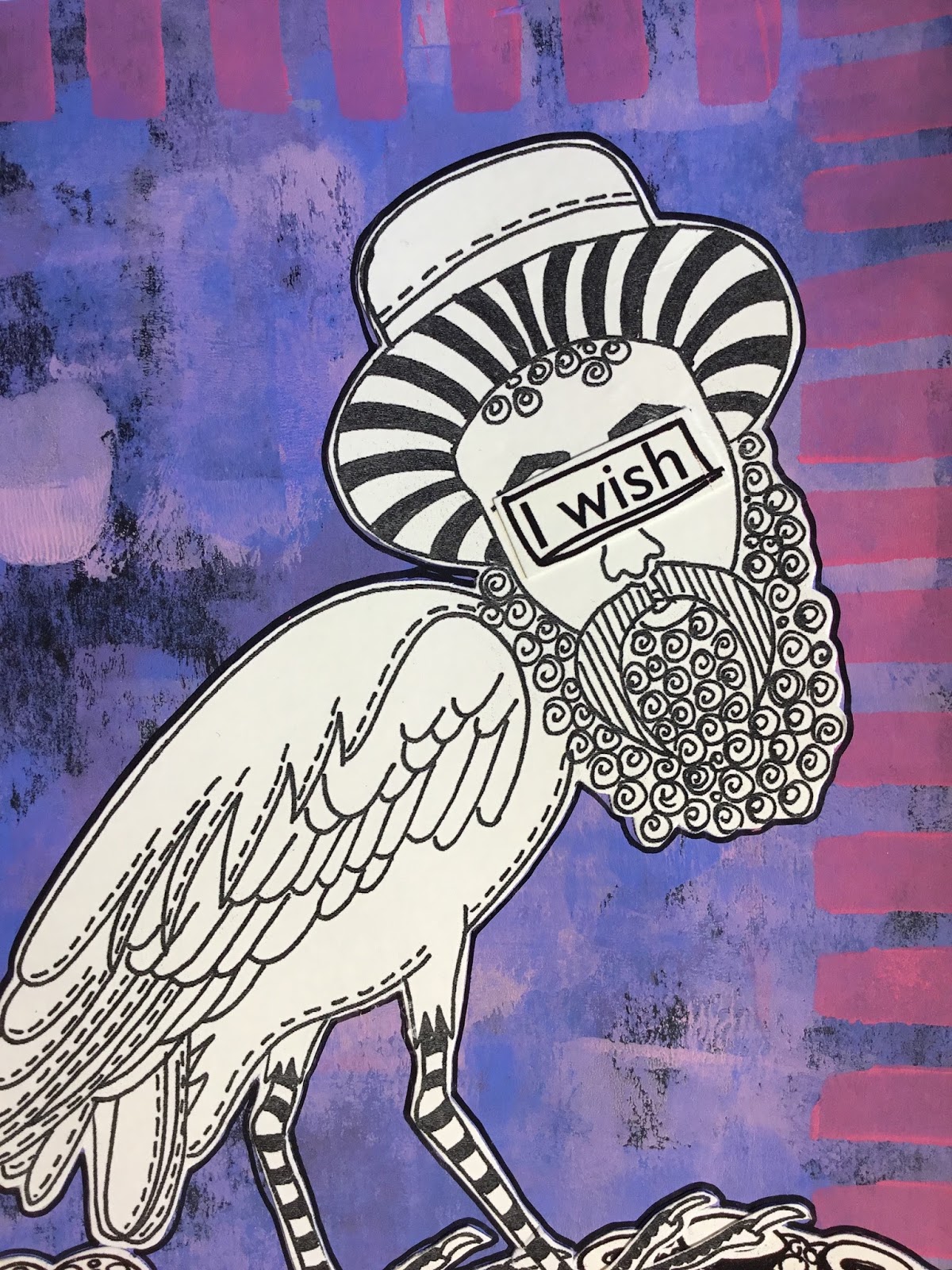 Here We have decorated a Craft tag using the New Dylusions paints, Laid-back Lilac, Periwinkle Blue and Vanilla Custard. The stamps used are a mix from the New Dylusions stamp sets; Waddle Waddle, Flight of fancy and Fabulous Called. The Stamps have been coloured in using Dylusions Ink Sprays and a water brush. The tag has then been doodled using the Dylusions Black Paint Pen.