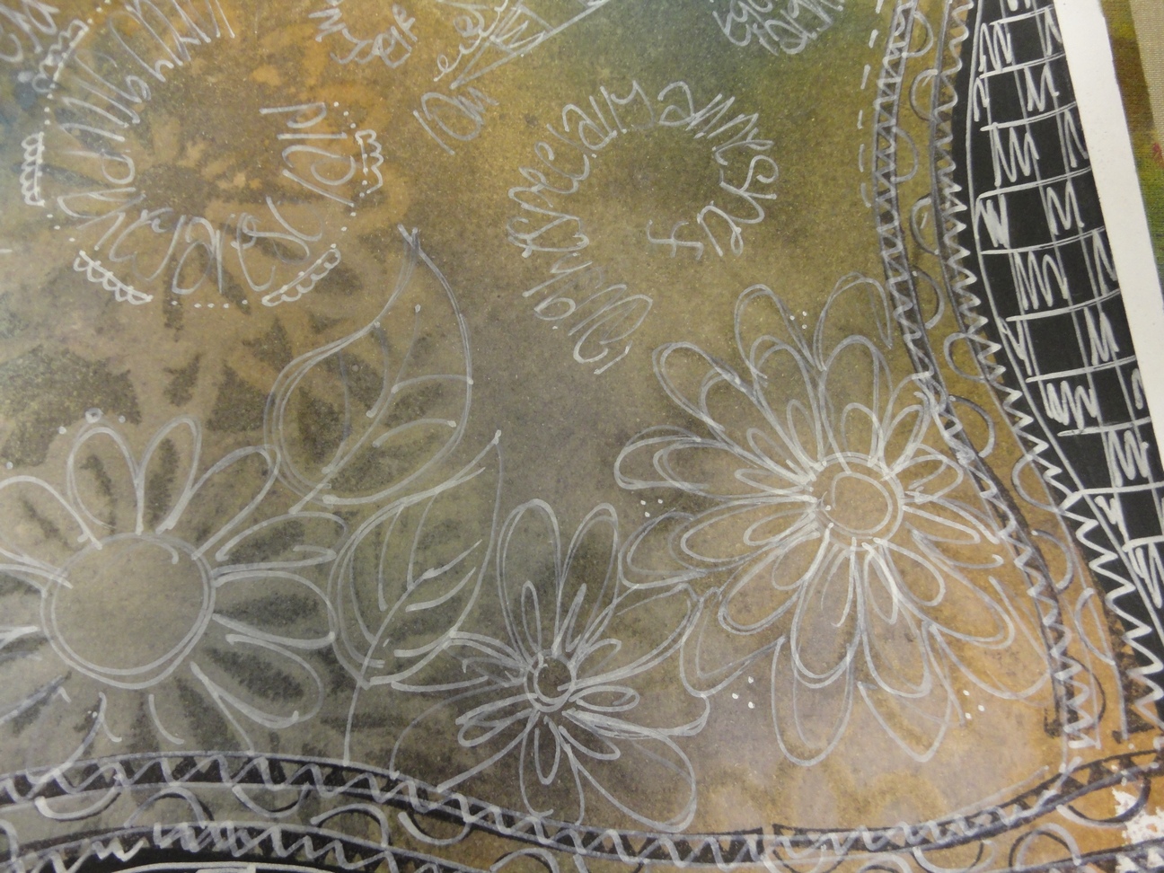 I then made them practise doodling with a white pen, freehand and through stencils, to make the pages pop. These are all works in progress and will be finished at a later date. Thanks to all who came, we had a ball. Special commendations go to the following.